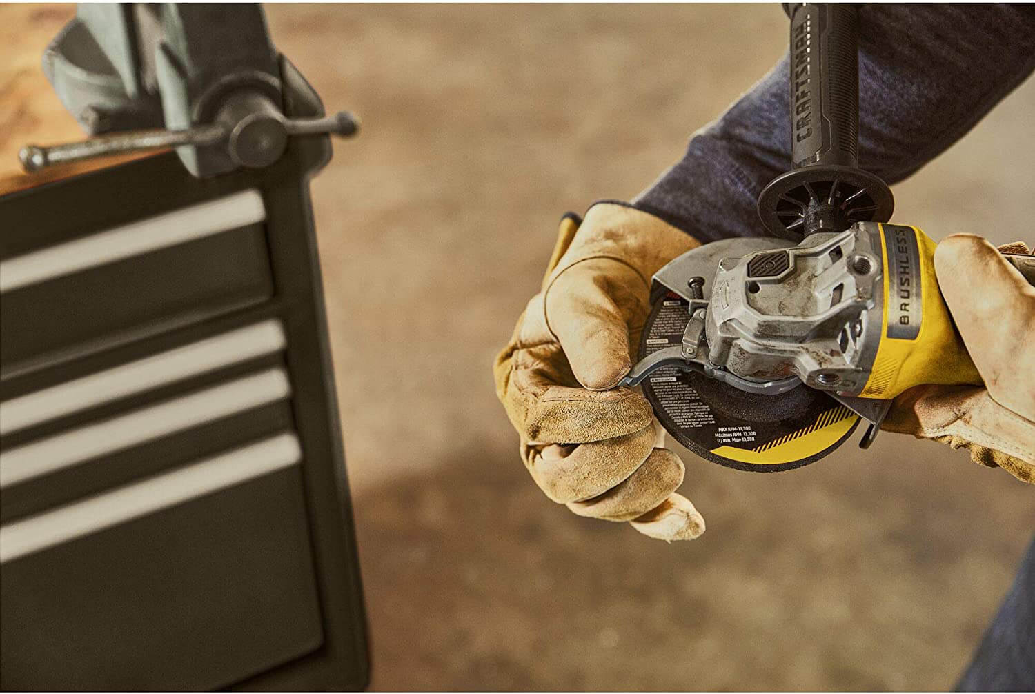 ✔ Блокування шпинделя для швидкої зміни диска та регульований захисний кожух для безпечної експлуатації.