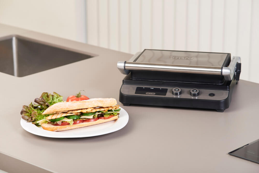✔ Портативний гриль з цифровим екраном, що відображає температуру та час приготування. Має двозонний контроль температури та універсальну плаваючу пластину, що регулюється відповідно до товщини їжі. Покриття зроблене з нержавіючої сталі, що не залишає відбитків пальців. Можна використовувати у відкритому вигляді до 180 °C, як настільний гриль. Оснащений вбудованим піддоном для витікання зайвого жиру та рідини. Пластини гриля знімні та односторонні. В комлпект входить додаткова плоска пластина для використання як сковорідка або гриль.